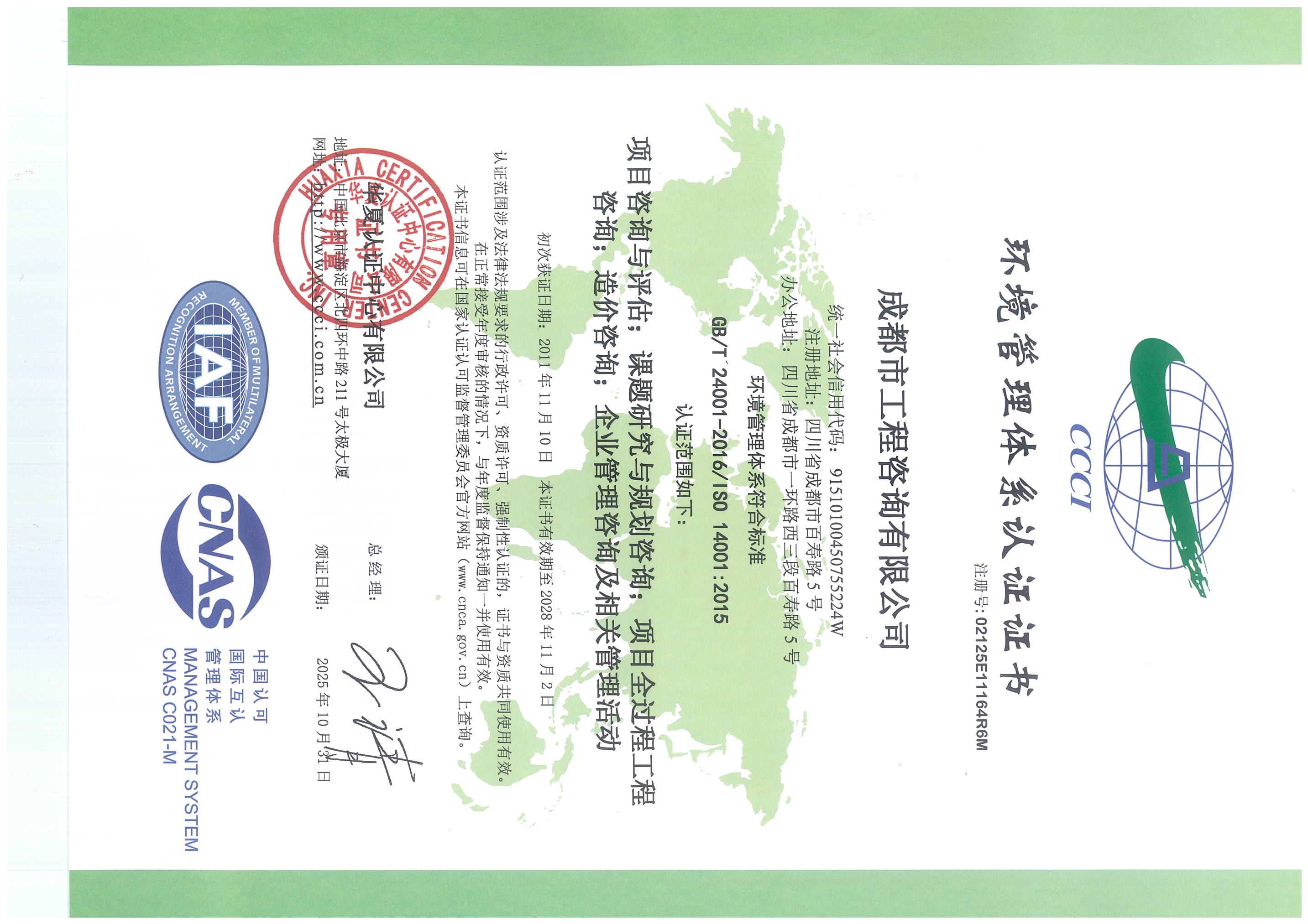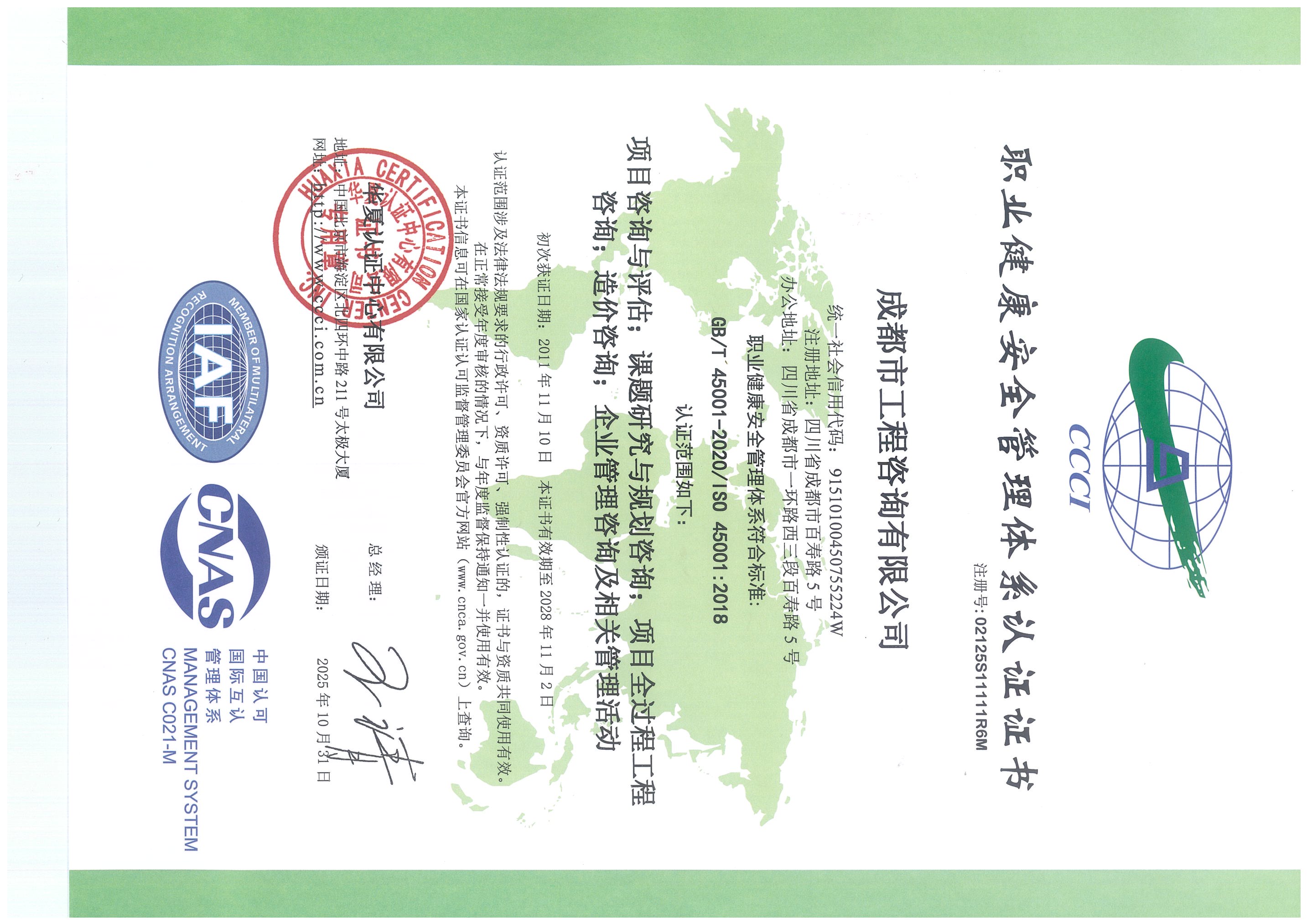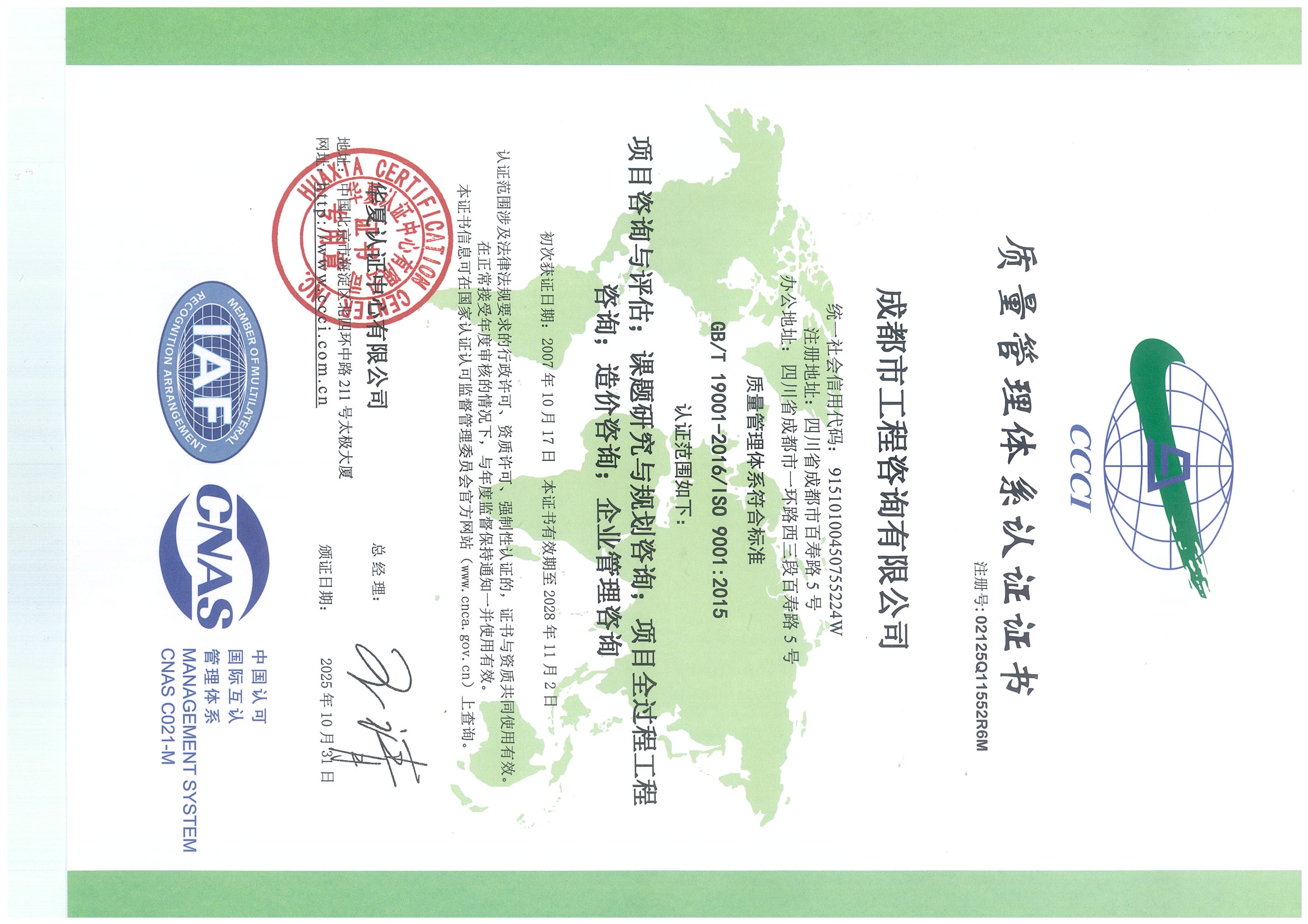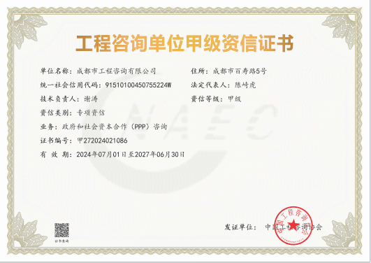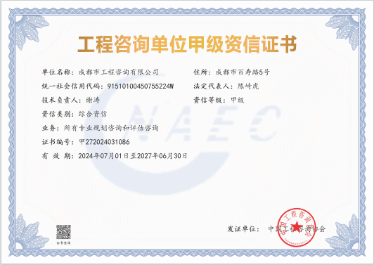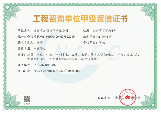 公司是四川省內(nèi)唯一同時持有甲級綜合資信、甲級專業(yè)資信和PPP甲級專項資信證書的綜合性咨詢機構(gòu),是四川省及成都市發(fā)展改革部門以及天府新區(qū)、東部新區(qū)、高新區(qū)、武侯區(qū)等20余個區(qū)(市)縣的政府投資項目咨詢服務(wù)機構(gòu)。公司擁有工程咨詢甲級綜合資信、甲級專業(yè)資信和PPP甲級專項資信三項甲級資信證書和工程造價資質(zhì)。甲級綜合資信由建筑,水利水電,農(nóng)業(yè)、林業(yè),電子、信息工程(含通信、廣電、信息化),市政公用工程,生態(tài)建設(shè)和環(huán)境工程,公路,其他(節(jié)能)8個甲級專業(yè)資信和電力(含火電、水電、核電、新能源),輕工、紡織,水文地質(zhì)、工程測量、巖土工程,建材,鐵路、城市軌道交通,其他(土地整理)和其他(旅游工程)7個其他專業(yè)組成。公司現(xiàn)已通過了GB/T19001-2016/ISO9001:2015質(zhì)量管理體系、GB/T24001-2016/ISO14001:2015環(huán)境管理體系和GB/T45001-2020/ISO45001:2018職業(yè)健康安全管理體系認(rèn)證。