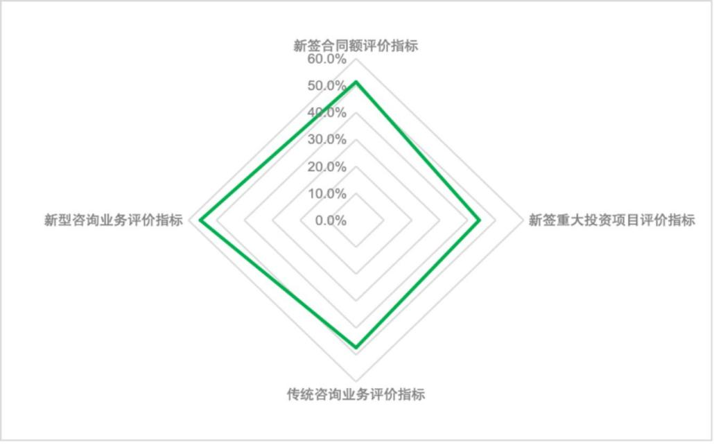 工程咨詢機構經營狀況分指數(shù)包括本單位新簽合同、本單位新簽重大投資項目、本單位傳統(tǒng)咨詢業(yè)務項目、本單位新型咨詢業(yè)務項目4個具體評價指標。其中本單位新簽合同評價指數(shù)為51.3%,本單位新型咨詢業(yè)務項目評價指數(shù)為55.7%。反映參調單位三季度業(yè)務量持續(xù)增加,三季度的業(yè)務增長主要以新型咨詢業(yè)務為主。