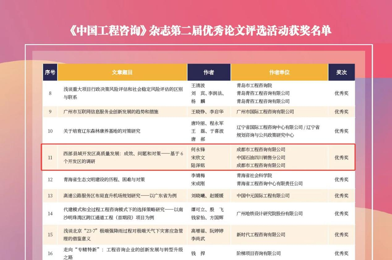為激勵廣大咨詢行業(yè)從業(yè)者積極參與學(xué)術(shù)研究與創(chuàng)新,促進高質(zhì)量學(xué)術(shù)成果的廣泛交流與傳播,《中國工程咨詢》雜志社開展了第二屆優(yōu)秀論文評選活動。評選范圍覆蓋2024年度發(fā)表在《中國工程咨詢》雜志上的共計193篇文章,經(jīng)過網(wǎng)絡(luò)評選以及專家委員會評審等嚴格的評比程序,公司撰寫的《西部縣域開發(fā)區(qū)高質(zhì)量發(fā)展:成效、問題與對策》一文榮獲優(yōu)秀論文獎。